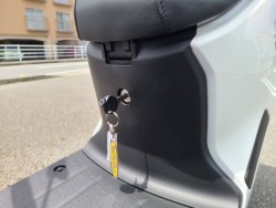■動力源のリチウムイオンバッテリーは簡単に着脱可能。自宅で充電可能です。0%から満充電まで約6時間(20%から満充電まで約3時間)・航続距離が約53kmと日常使いにぴったり