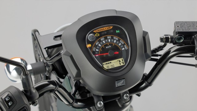 メーター内に、速度警告灯、ギアポジションと燃料計を常時表示し、時計/TRIP/走行距離/平均燃費表示