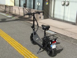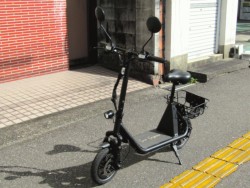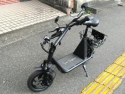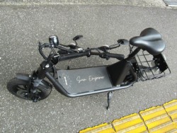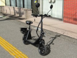 免許不要な特定小型原付の電動バイク。電動キックボードにはない買い物カゴやサドル、12インチタイヤが装備されています。100Vの家庭用コンセントで充電でき、車検も不用なのでコスパが魅力です。
