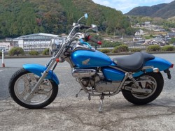 マグナ フィフティ(MAGNA FIFTY マグナ50) ホンダ横型エンジンを搭載した、原付1種のアメリカンカスタムクルーザー 4速ミッション 同じ原付1種アメリカンのジャズ(JAZZ)と2機種存在していました。後発のマグナ50はいまでも絶えない人気を誇っています。カスタムカラー(ブリスクブルーメタリック)、社外マフラー、社外ハンドル、社外ミラー等カスタムしてあります。