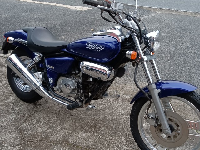 原付アメリカンの一番人気マグナ50 ライトチューン車両 超希少キタコ75ccボアアップキット(49cc刻印)とキタコ強化クラッチの組み合わせでトルクフルに走ります。見た目ノーマルも魅力!!走行距離多めですがエンジン腰上オーバーホール済みです。
