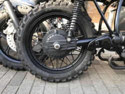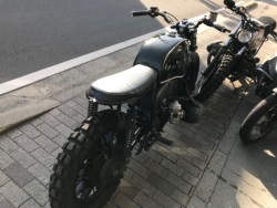 スクランブラーカスタム車、全体的に綺麗に適材適所なペイント、コーティングを施工しています。ホイールはパウダーコート。エンジン、ミッション、ドライブギヤボックス、フォークボトムなどはセラコート。フレーム、タンク、各小さなパーツ類は2液ウレタン塗装。シート、サブフレームをセットで製作。ハンドル、ライト、ウインカー、テールランプ類交換。ウインカーとテールランプはモトガジェットとケラーマンを使用。バッテリーは小型リチウムSHORAIバッテリー、他電装品交換。マフラーは、お好みに合わせて、ショート砲弾やミドル砲弾型など選んでいただけます。ハンドルもセパハン、写真のアップ、他ダウンタイプなど選んでいただけます。タンクカラーもお好きなカラーにて製作可能。タイヤ、フレーム形状も色々なタイプで製作しています。