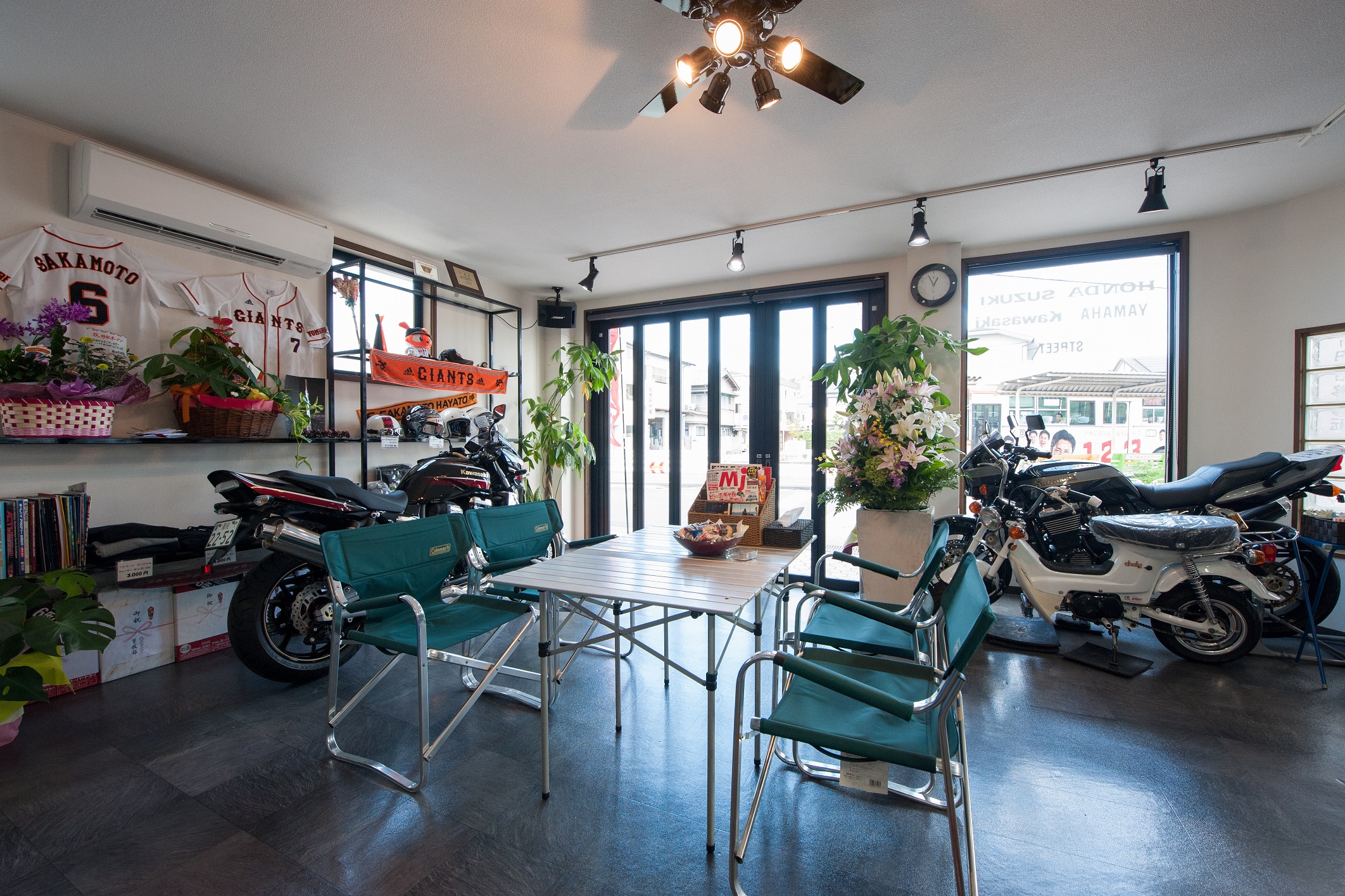 店内はカフェのような落ち着いた雰囲気です。新車・中古車販売、高価買取、カスタム、修理まで幅広く対応致します。 原付から大型車まで、経験豊かなカリスマメカニックがあなたの愛車をお預かりします。 ご来店をお待ちしております。