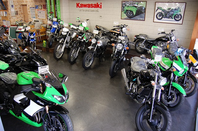 店内はカワサキ新車でいっぱい