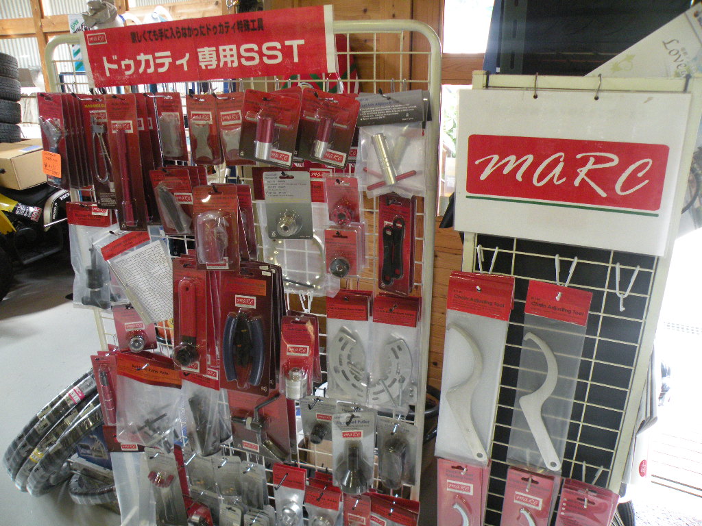 店舗面積の関係で、ご来店時にご希望の車両が店舗にない場合がございます。事前にご来店日時と時間をご連絡いただけましたら店舗に準備しておきますのでお気軽にご連絡ください。 これからバイクや車にチャレンジしたい方免許取得から車両選択など丁寧にアドバイスさせていただきます。マルクでは国産車・輸入車問わず販売・買取・車検・修理・カスタムを行なっております。当店は国内・海外よりお好きなバイクを探します。乗らなくなった車両の出張査定、高価買取いたします。お気軽にお問い合わせください。 当店オリジナルドゥカティ特殊工具も多数取り揃えております。