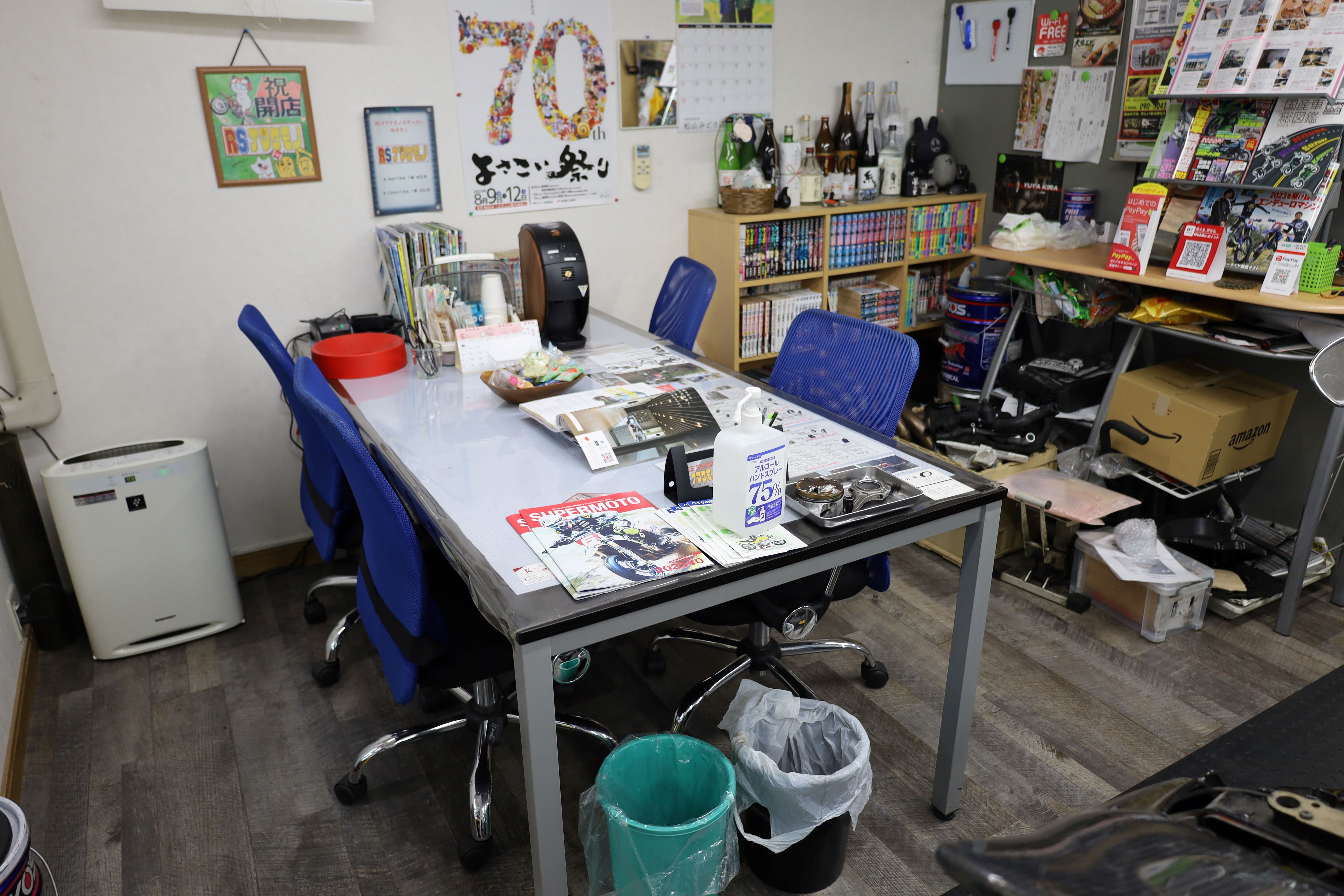 来店時にはこちらのテーブルでおくつろぎください!お飲み物も用意しています!